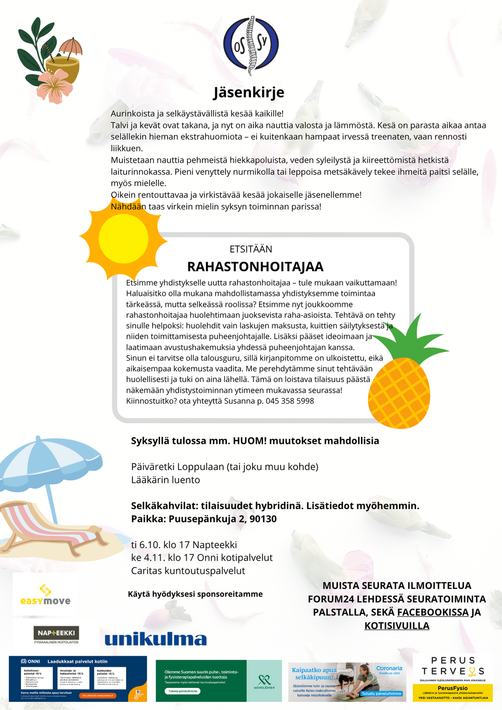 Liittymällä Oulun Seudun Selkäyhdistyksen jäseneksi saat tietoa ja tukea selkäongelmiin, voit osallistua erilaisiin liikuntaryhmiin ja vertaistukitoimintaan. Saat myös neljä kertaa vuodessa ilmestyvän Hyvä Selkä - jäsenlehden.