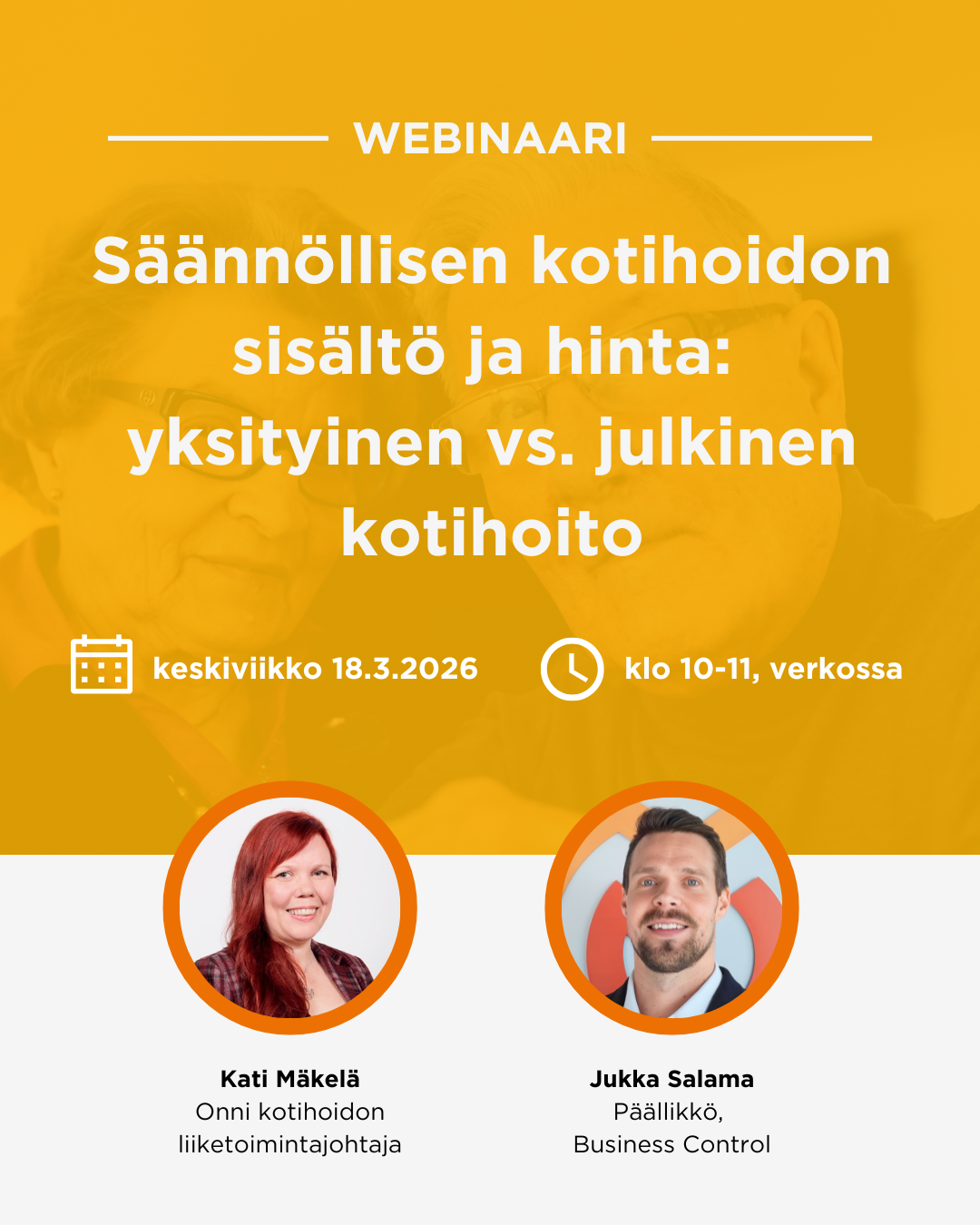 Tiesitkö, että julkisen kotihoidon maksut määräytyvät tulojen mukaan ja maksavat eri verran eri henkilöille? Joskus yksityinen kotihoito voi olla jopa edullisempi vaihtoehto. Webinaarissa käymme läpi, mitä säännöllinen kotihoito tarkoittaa arjessa, mitä julkinen ja yksityinen kotihoito sisältävät, miten niiden hinnat muodostuvat sekä mitä asioita kannattaa vertailla ennen päätöksentekoa. Vastaamme myös osallistujien kysymyksiin webinaarissa.”